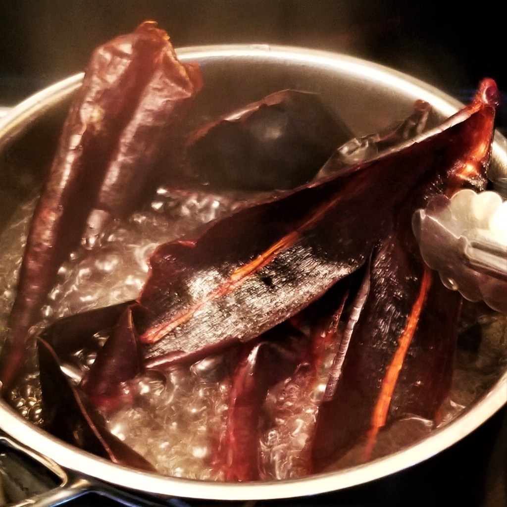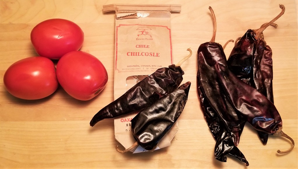 I had only a couple of chicosle peppers left from my order of specialty peppers (previously posted here), so I supplemented with guajillo; please note that guajillo peppers are milder than chicosle, so they can be used to regulate the hotness level, as well.