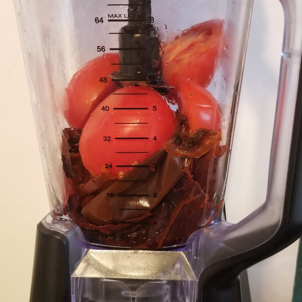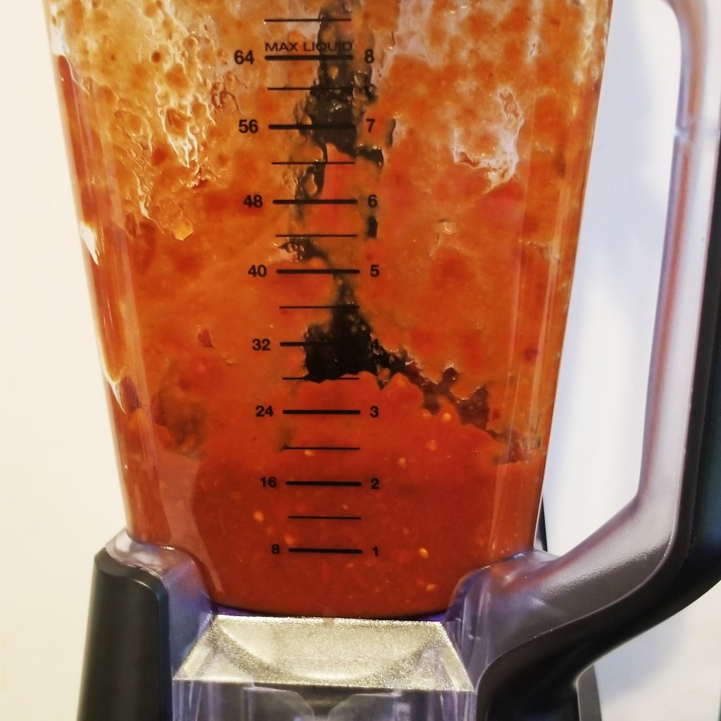 Place peppers with about half a cup of liquid from the pot in a blender jar; slice tomatoes into large chunks, and add to the jar (photo below, left). Process long enough to obtain a very smooth sauce (photo below, right):