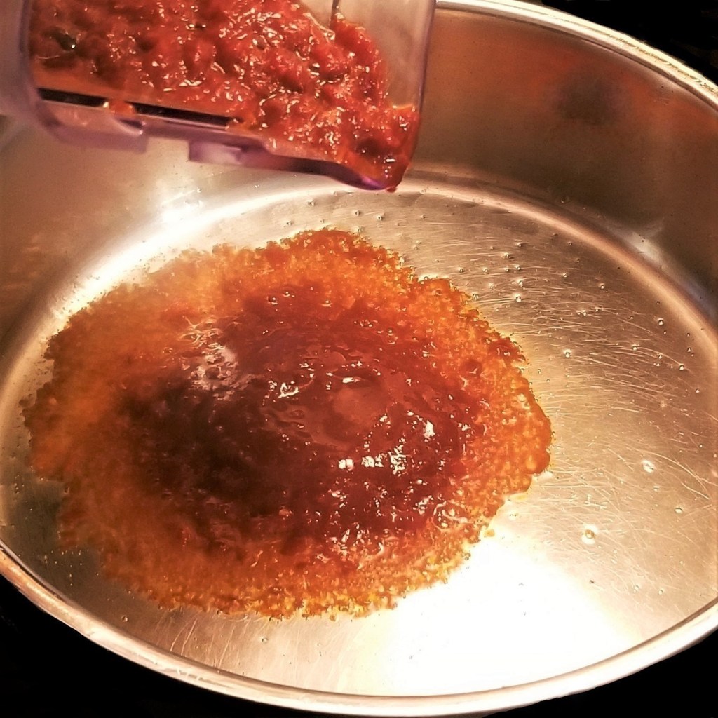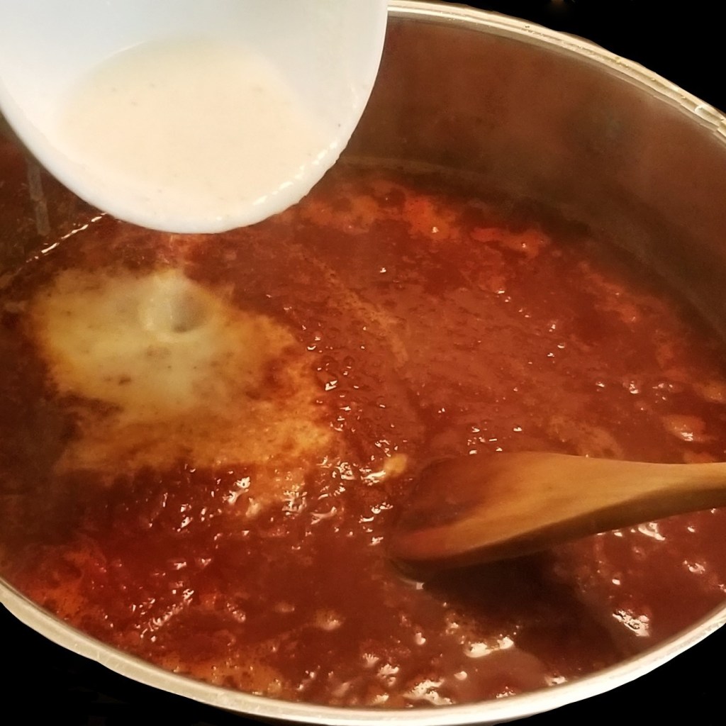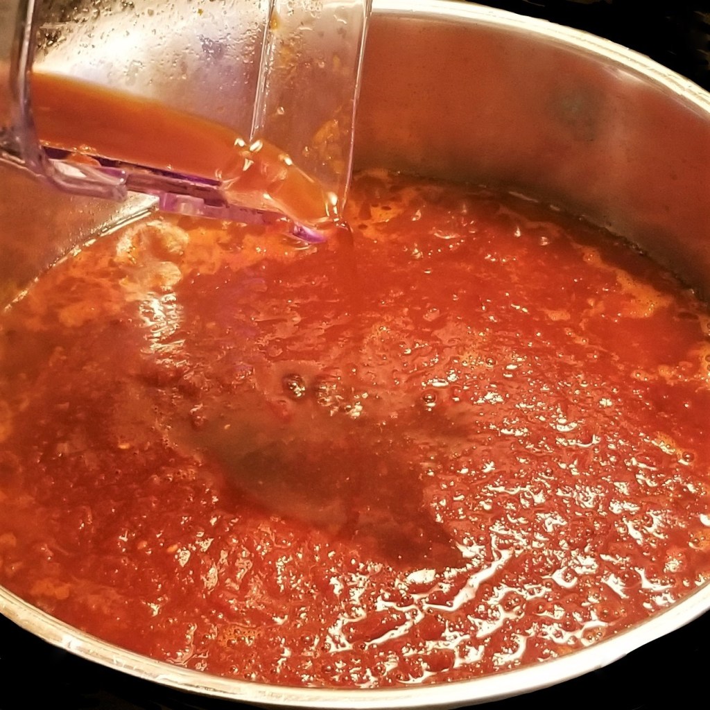 Warm up two tablespoons of oil in a large pot over medium heat, then pour the sauce in (photo below, left); add about one cup of water to the blender jar, to gather any leftover sauce, then pour into the pot (photo below, right):