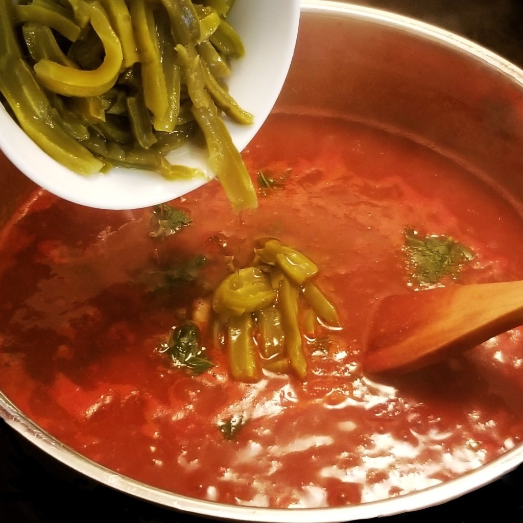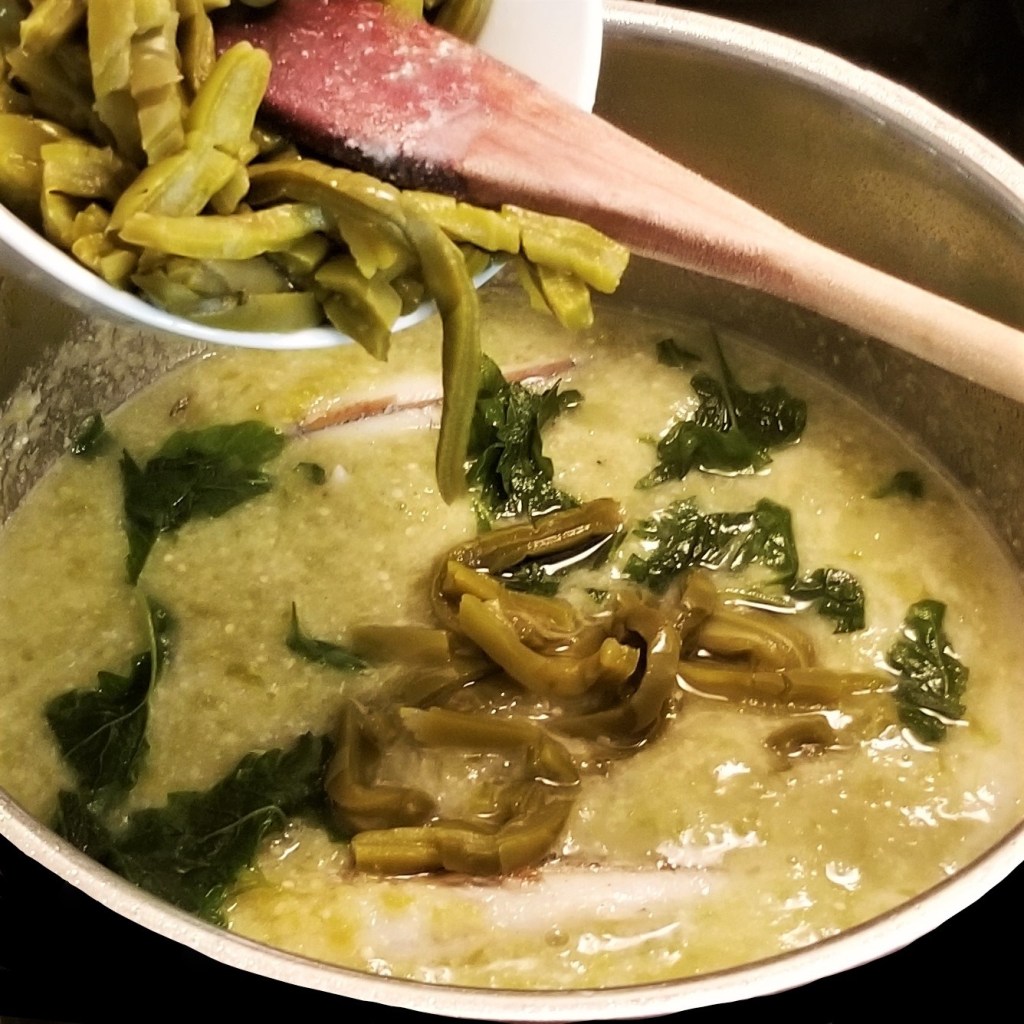 Add epazote and cooked cactus strips (photo below left); finally, add greens (photo below, right):