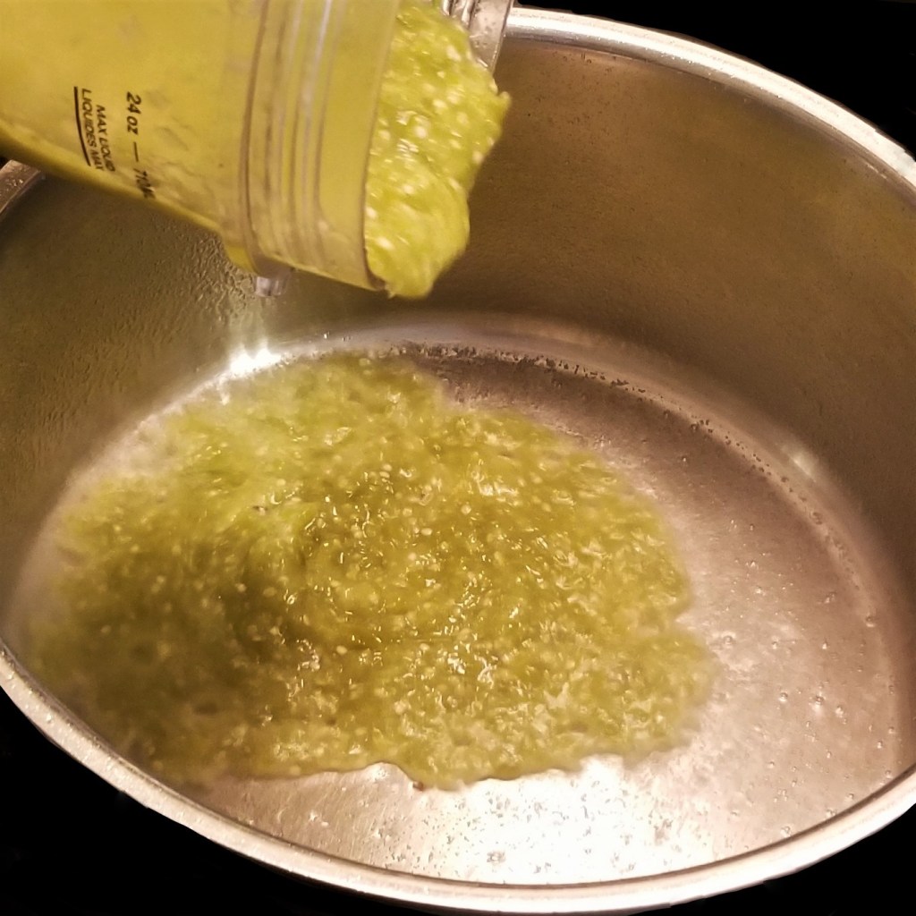 Follow the same steps as for the red sauce: warm up two tablespoons of oil in a large pot over medium heat, then pour the sauce in (photo below, left); add about one cup of water to the blender jar, to gather any leftover sauce, then pour into the pot (photo below, right):