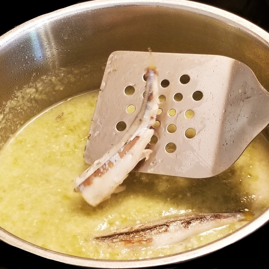 This step is optional; pan fry the small fish in two tablespoons of oil over medium heat, to add flavour, and prevent them from breaking later on, when added to the sauce: