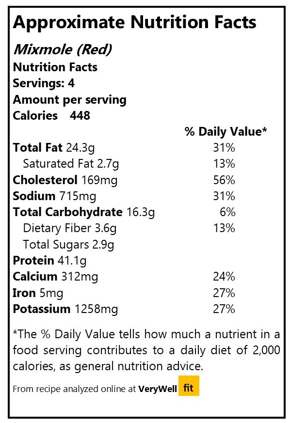 This is an approximate nutrition analysis for one portion of mixmole with red sauce, but the green version would be very similar, calorie wise: