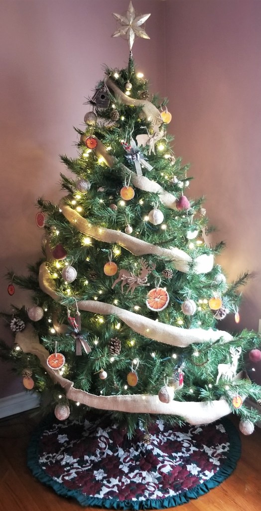 In contrast to my niece’s colourful Christmas tree in Mexico from my previous post, my Christmas tree in Canada has a neutral palette this year, and the main accents of colour come from citrus fruit slices: