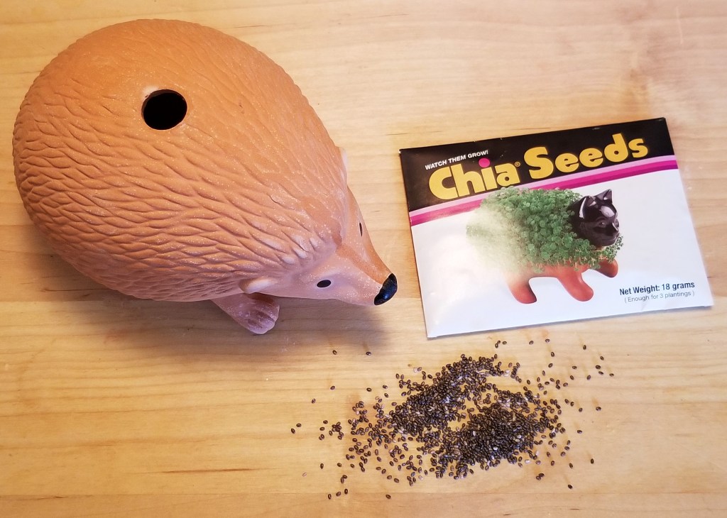 1) Chia Pet™ .- These were marketed from a traditional Mexican handcraft of clay vessels, predominantly made in the state of Oaxaca; they are often crafted in the shape of rams or deer, with green glazed heads, and then chia seeds are sprouted to cover the body. In Mexico, these pieces are still used as part of offerings, or as ornaments (click here to see some examples @ Casita Colibrí). The word chia is derived from the Nahuatl word chian – oily. Chia (Salvia hispanica) is a plant native to Southern Mexico and parts of Central America; although chia sprouts were not grown for consumption in pre-Hispanic Mexica communities, there were two kinds of chia seed that were appreciated for nourishment and as religious offerings: chianpitzáhuac (black chia, as seen in the photo, below) and chianpatláhuac (white chia). Sometime in the 1970s, Joe Pedott, an American entrepreneur, bought the rights to the name “chia pet”, along with the small company that imported the clay animals directly from Mexico to the USA. In the 1980s, the product sales reached their zenith, when the pets became a fad; the company started offering not only sheep and deer, but bulls, dogs and other figures. Because of the high demand, the unfathomable happened, and production was moved to China. Nowadays, Chia Pets™ are a popular Christmas gift, in the shape of many different animals, cartoon characters, and personalities, still made of clay, to be covered with chia seed that will sprout into green wool, hair, or even spines, as in the case of my cute hedgehog:
