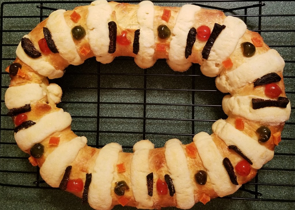 The Twelve Days of Christmas are now coming to an end with Epiphany Day, marked on the Catholic, and other Christian calendars, as January 6. One of my daughters was in France for a year, where she met her boyfriend, a native of Lyon; he is visiting Canada, so another tradition my family is starting this year is making a French galette des rois for Epiphany Day. I have talked before about the celebration of Epiphany Day in the Christian faith, and the associated Mexican traditions, including partaking of “la rosca de reyes” (photo below, left), the Mexican Epiphany Bread (click here for full story and recipe.) The photo on the right shows the galette freshly baked last night by my daughter and her boyfriend: