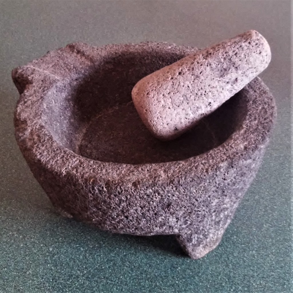 2) Molcajete .- This is the Mexican mortar, made traditionally of volcanic rock, since pre-Hispanic times; it comes with a pestle called tejolote. I have shared an image of a molcajete with tejolote as part of my family heirlooms, a well-worn piece from the 1950s: