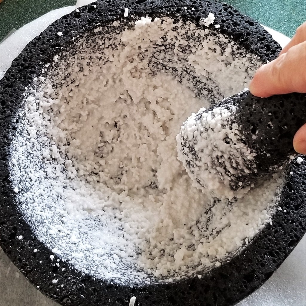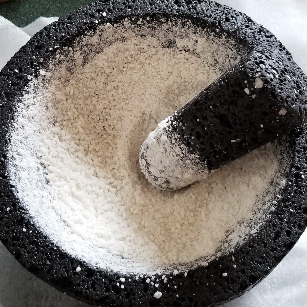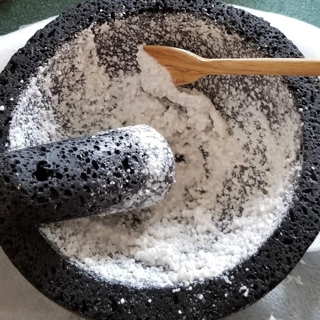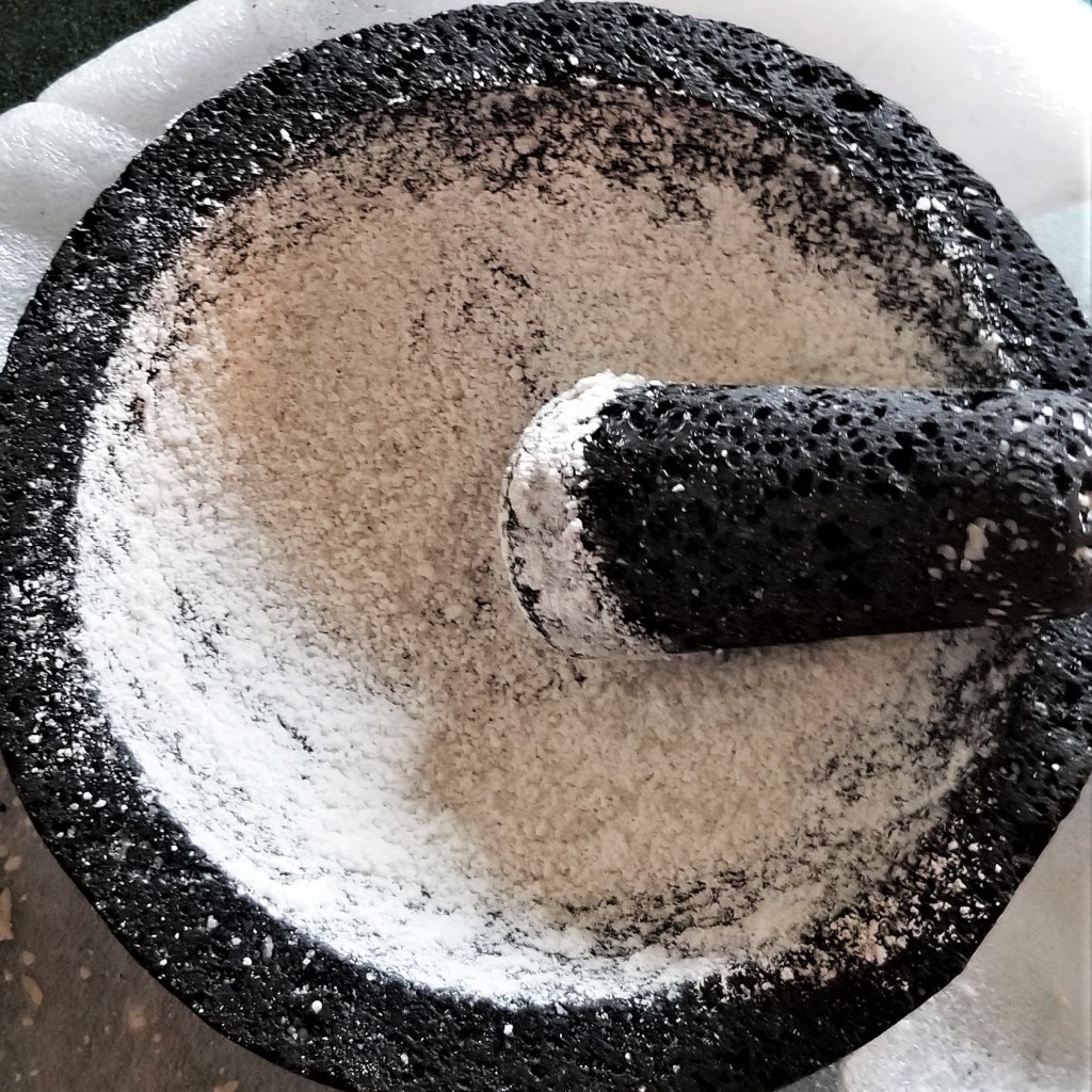Once at home, a brand new molcajete must be providently cured, to partially polish the surfaces that will be in contact with food, as well as to remove any loose rock particles.