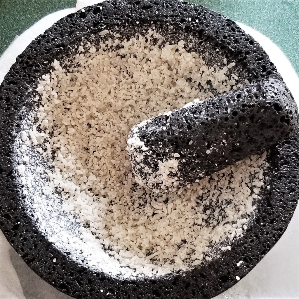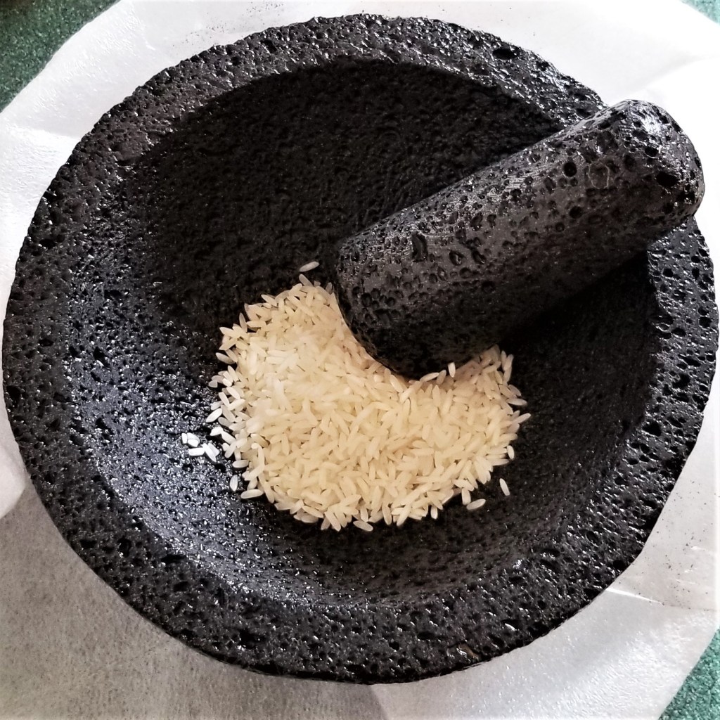 My molcajete has already changed visibly from before curing (photo below, left), to after four grinding rounds with rice (photo below, right):