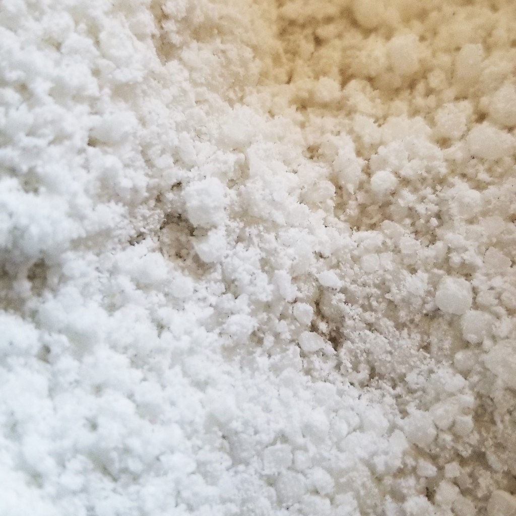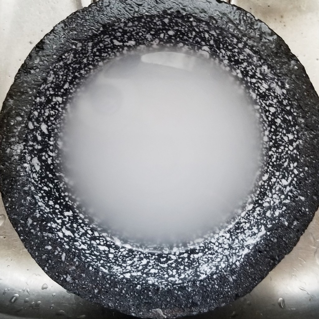 Add a second handful of raw rice and repeat.  Flip the pestle to polish the other end.  Comparing to the first grind, notice the finer grind (photo below, left), and already much smaller rock speckles (photo below, right):