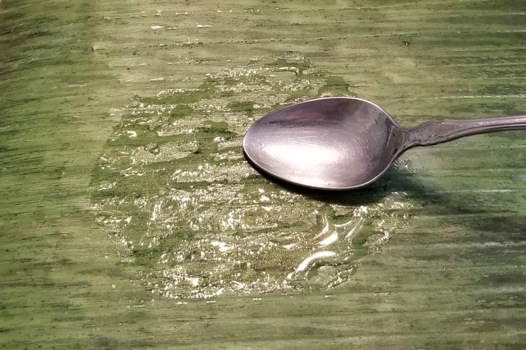 Spread about one teaspoon of melted lard (or oil) on the centre of the leaf, about a 5×5″ (12.5×12.5cm) area: