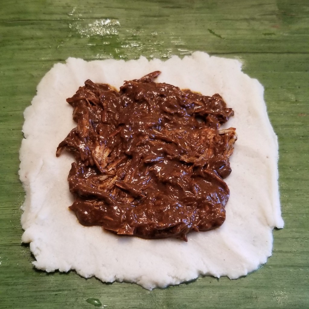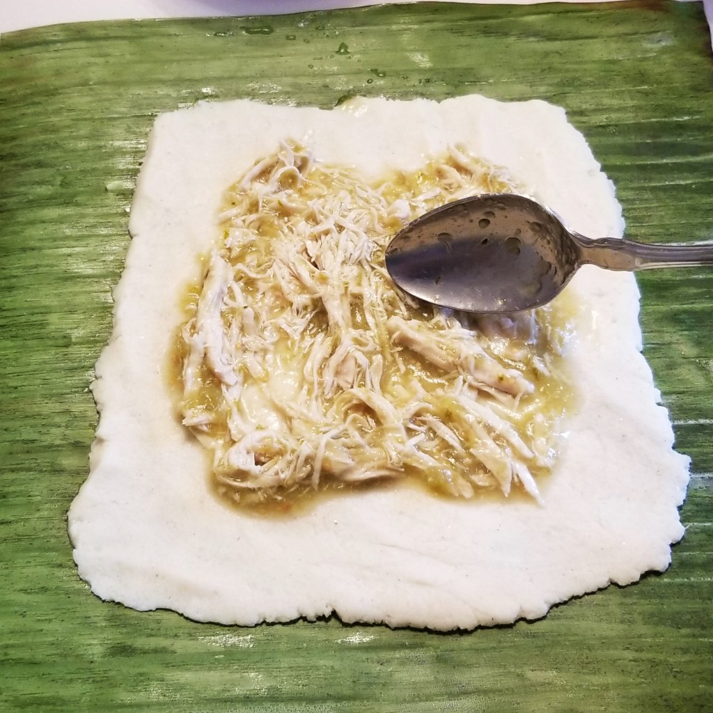 Scoop one quarter of one of the fillings onto the centre of the corn paste square, leaving one inch around the edges of the paste without filling. In the photos below, chicken with green sauce (left) and chicken with mole (right):