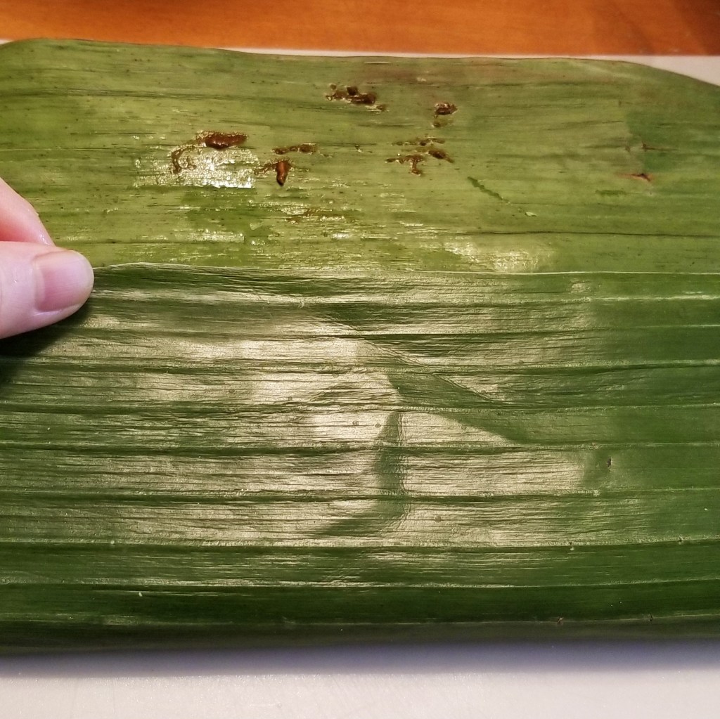 Prepare banana leaves: If starting with frozen leaves, place package in the fridge to thaw the night before, then allow to reach room temperature before preparing them for the tamales: