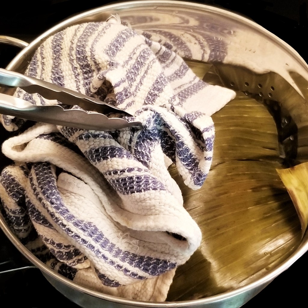 Place lid on, completely closing the top (photo below, left). Cook over high heat to make sure the water is boiling, then reduce to a rolling boil, and let the tamales steam for at least one hour. I always check the bottom of the pot halfway through, to make sure it is not drying too fast; if needed, add boiling water. After one hour, carefully open the pot and move towel to the side (photo below, right):