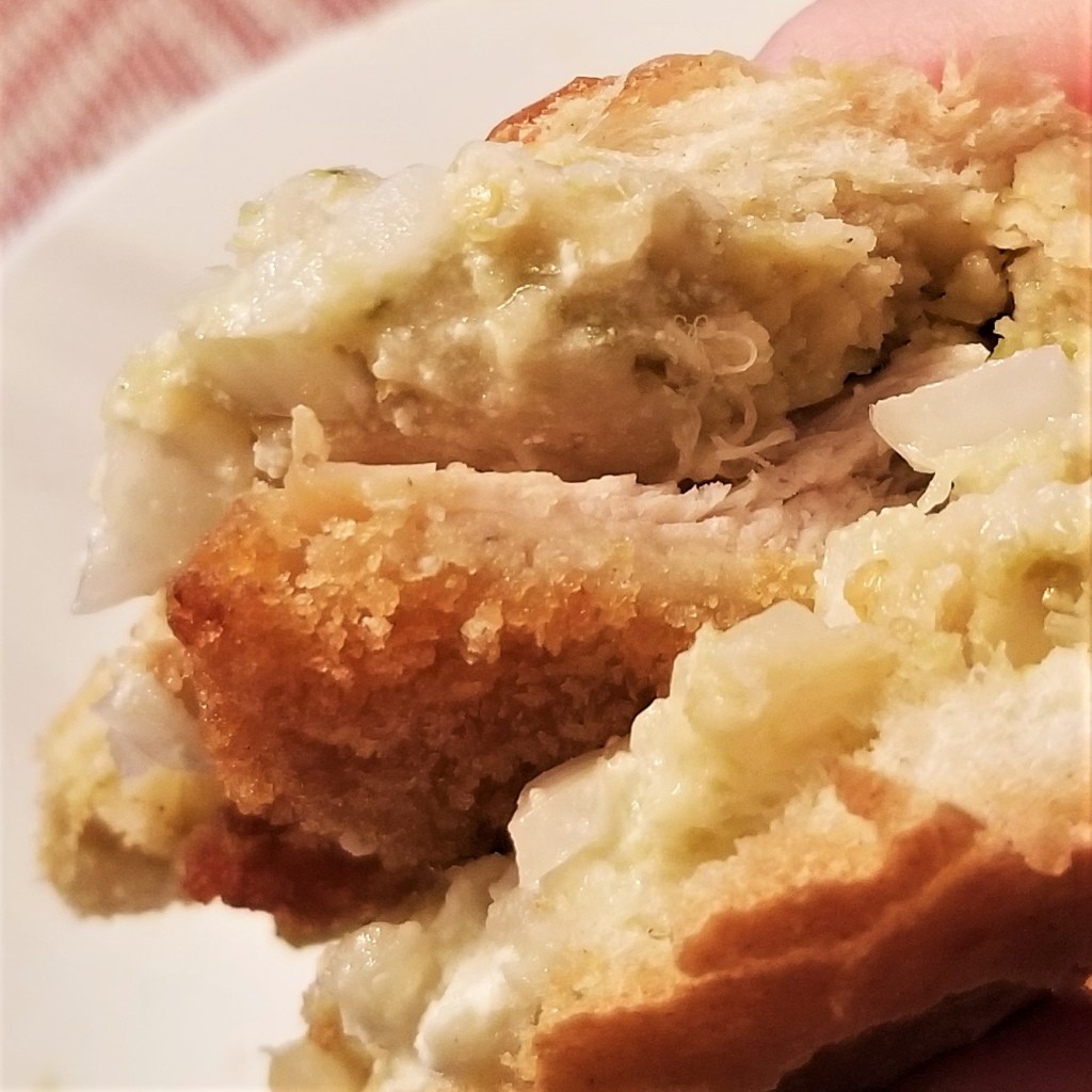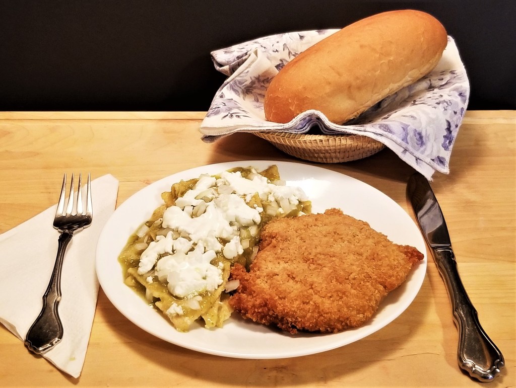 There is not much of a recipe; it starts with a batch of red or green chilaquiles (click here for recipe) topped with onions, cream, and fresh cheese, and a generous portion of breaded chicken cutlet, which, along with a crusty bun, could be served as a plated meal: