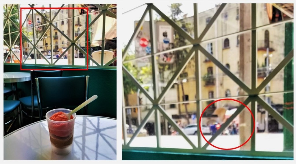 Funny Fact: In pre-pandemic times, in 2019, there I was, in Mexico City, right at the corner of Alfonso Reyes and Tamaulipas streets, not at the torta de chilaquiles stand, but diagonal to it, enjoying a cold treat at “Nieves Roxy”, an ice cream parlour I knew from my youth. I noticed a big crowd across the street, but I did not think of finding out what it was at the time (tortas de chilaquiles were invented after I had moved to Canada, so the stand was not familiar to me.) While preparing this post, it suddenly clicked what that big crowd was about (as I said, hundreds of people enjoy these tortas every day!) and went back to my photos to see if I had by any chance captured the torta stand. I found the photo below, taken from inside the ice cream parlour, showing the spot with a big crowd, in the background (LOL):
