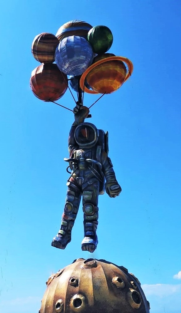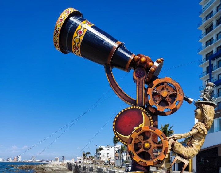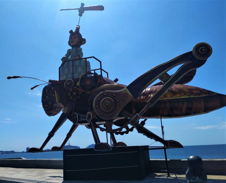 This year, the carnival in Mazatlán is running from February 24, until March 1 (Shrove Tuesday); my sister and brother in-law were there last week, and had a chance to capture images of a few of the monigote sculptures along the pier, created by artists Jorge González Mata, and Henry Wilson.   In the slide show, below, “Aerostatic Fish”, “Mechanical Grasshopper”, “Wish in the Firmament”, and (also at the top of this post) “Fantasy to the Moon”: