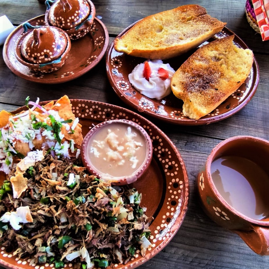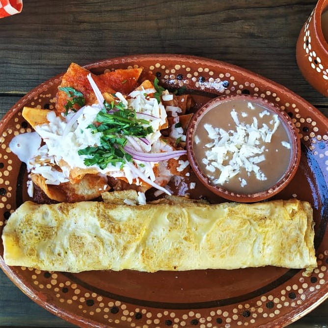 Needless to say, there are plenty of foodstuffs around the city, in special exhibitions of International and local cuisines, and at hotels, and restaurants.  The last day of Carnival, Shrove Tuesday, also known as Fat Tuesday or Mardi Gras, is for many Christians, the last day of eating rich, fatty foods before entering the fasting or diet restrictions of the Lenten season.  For a Mexican Fat Tuesday meal, how about a robust brunch, like the one my sister and brother in-law enjoyed at the country style restaurant “El Tenampa; the photo below, left, shows a shared plater of toasted buns and natas (freshly skimmed cream), and (click on highlighted text for my recipes): a plater of machaca a la mexicana (a dry beef and veggie stir-fry), while the photo below, right, shows an equally tempting omelette, both platers served with chilaquiles (tortilla chips smothered in salsa),  and frijoles “caldudos” (“brothy” beans):