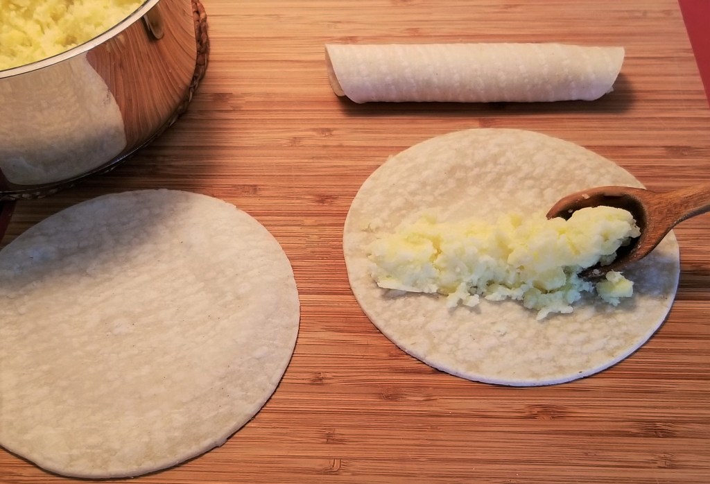 Divide mashed potatoes amongst tortillas, rolling each tightly to form tacos: