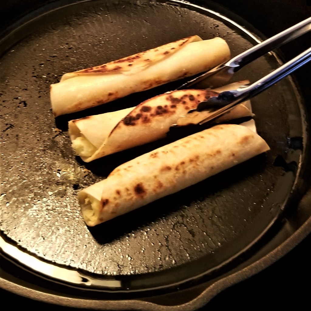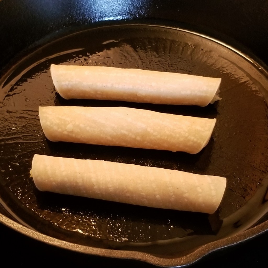 Warm up oil in a skillet or heavy pot over medium heat; add tacos, cooking and flipping until crisp. For deep frying, it takes only a minute or two until they turn golden brown; I decided to crisp using a small amount of oil, placing tacos with the seams facing down (photo below, left), then flipping after a couple of minutes, to crisp other side (photo below, right):