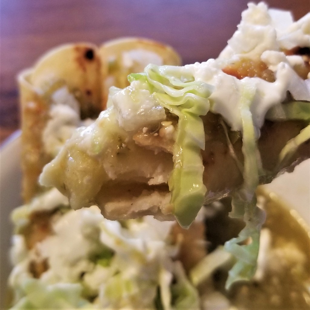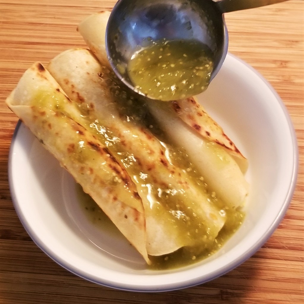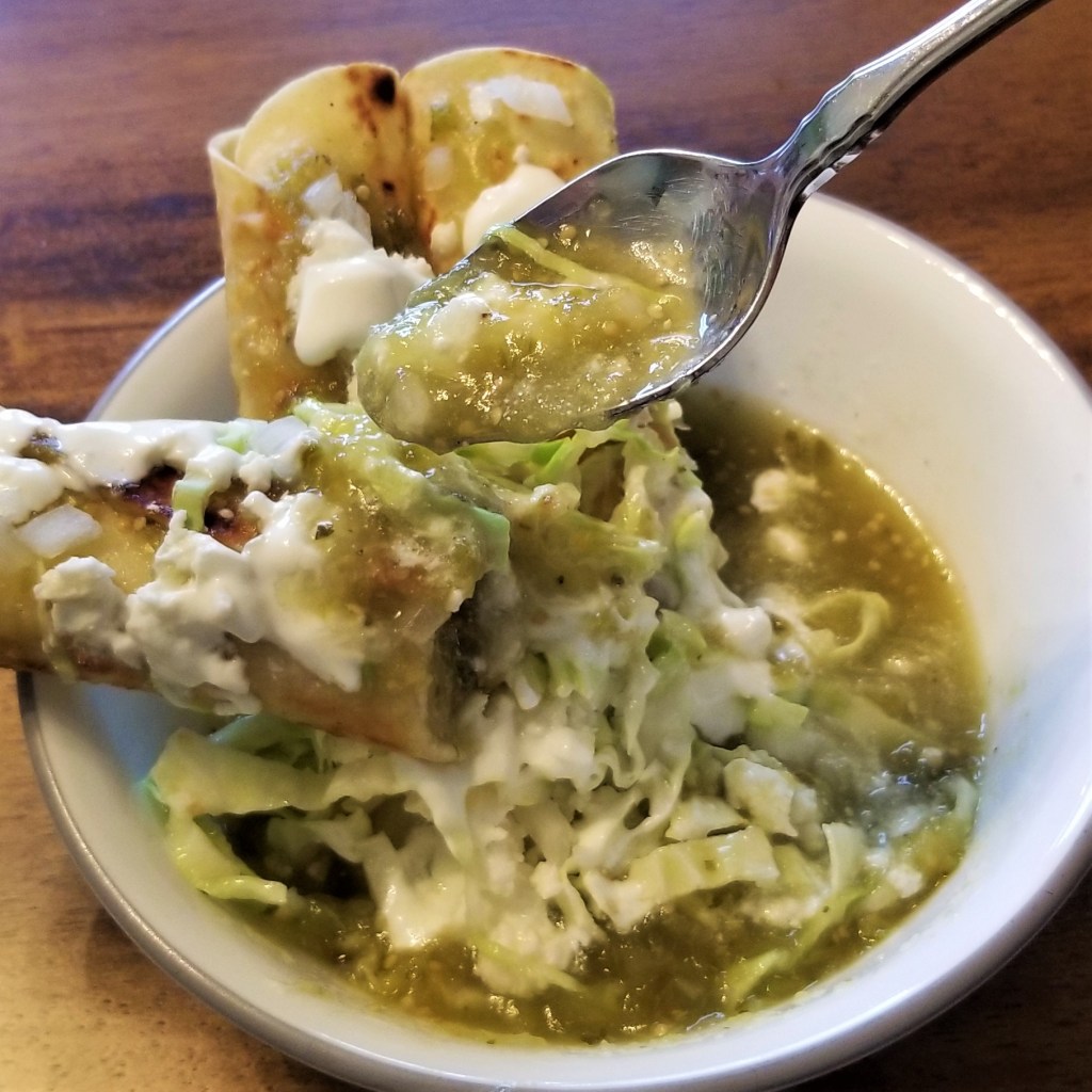 In Mexican cuisine, the term ahogado (drowned, in English) is not a matter of concern, but refers to foodstuffs served immersed in a liquid, such as a salsa or a thick broth. I have posted about tortas ahogadas (drowned Mexican sandwiches), and there are also drowned eggs, but the concept is probably best epitomized in tacos ahogados. These tacos are always prepared with corn tortillas and then fried until crispy, but different regional recipes call for specific fillings, toppings and “drowning” liquids. For example, in Guerrero, crispy tacos are filled with chicken, topped with cabbage, cream and cheese and served in a bowl filled with chicken broth; as a street food, they are offered in a plastic cup, to prevent them from dishevelling. In San Luis Potosí, the tacos are filled with pork meat, and helpers would be henpecked by the matron in the kitchen if they forgot to drown them in the specific dried red chile sauce before frying. In Mexico City and neighbouring states, there are some novel versions, such as the famous birria tacos, but served ahogados in a bowl filled with birria broth, instead of as a side; also, crispy tacos and flautas (longer and thinner crispy tacos), are drowned in salsa, filled either with meat or vegetarian options, such as potatoes, which is my choice in this post.