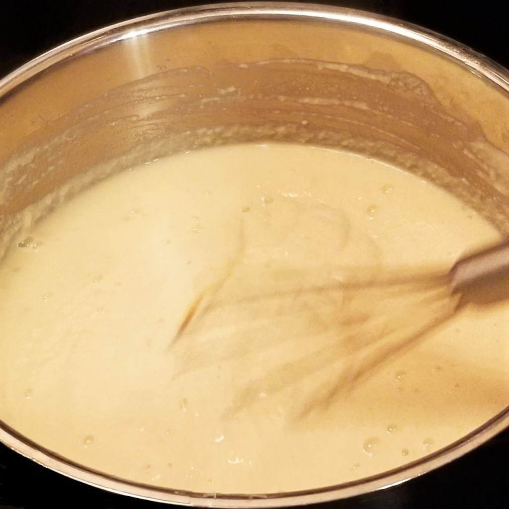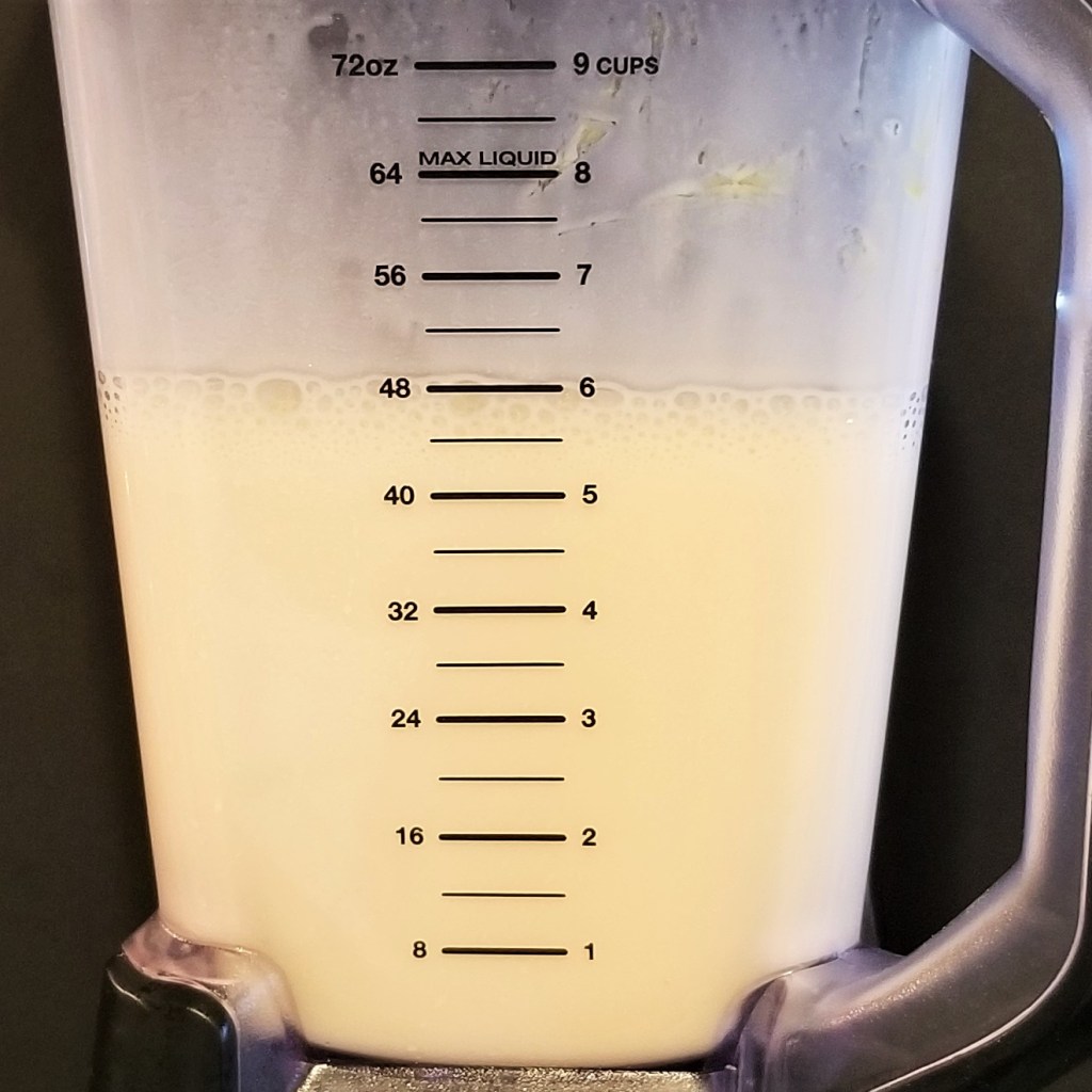 Place the three milks and the three eggs in a blender jar (photo below, left). Process for about one minute, until perfectly mixed (photo below, right):