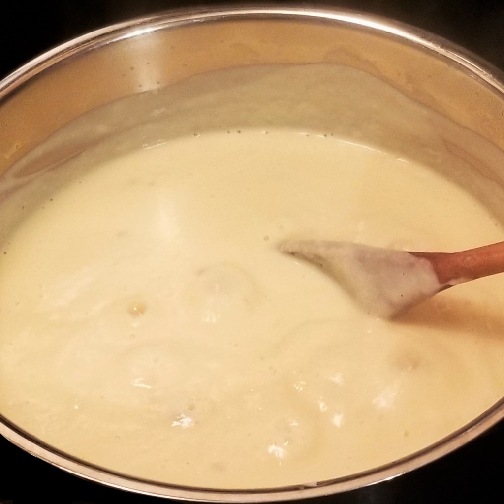 Pour into a pan over medium heat, and warm up, stirring with a wooden spoon, until it starts to foam (photo below, left). Lower heat a little, to prevent boiling over, and continue cooking between 15 and 20 minutes, stirring constantly to avoid sticking to the bottom of the pan, just until the mix thickens and begins to gently gurgle, coating the spoon and the wall of the pan (photo below, right):
