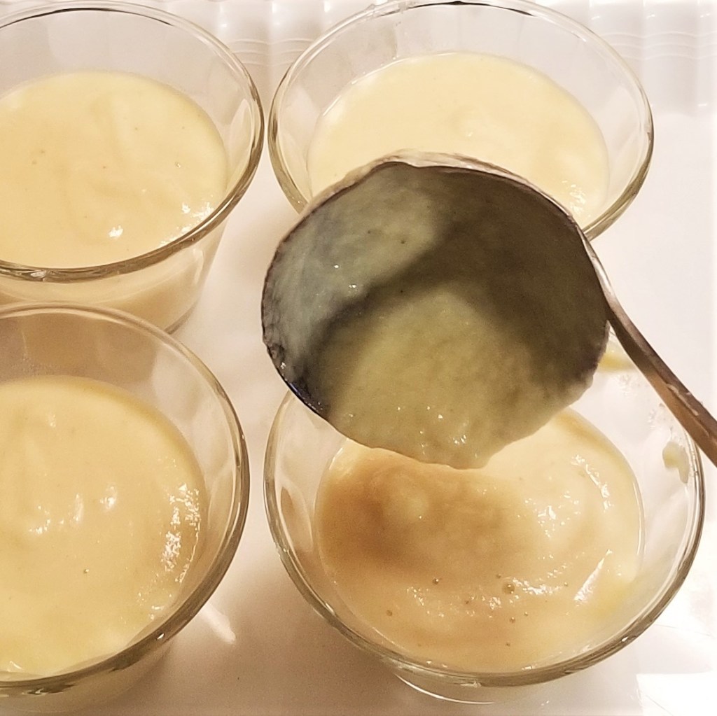 Remove pan from heat promptly, and beat vigorously with a whisk for a couple of minutes, so the eggs will not overcook or separate from the mix (photo below, left). Once cooled down slightly, divide into eight small ramekins (about 2/3 of a cup per portion, photo below, right):