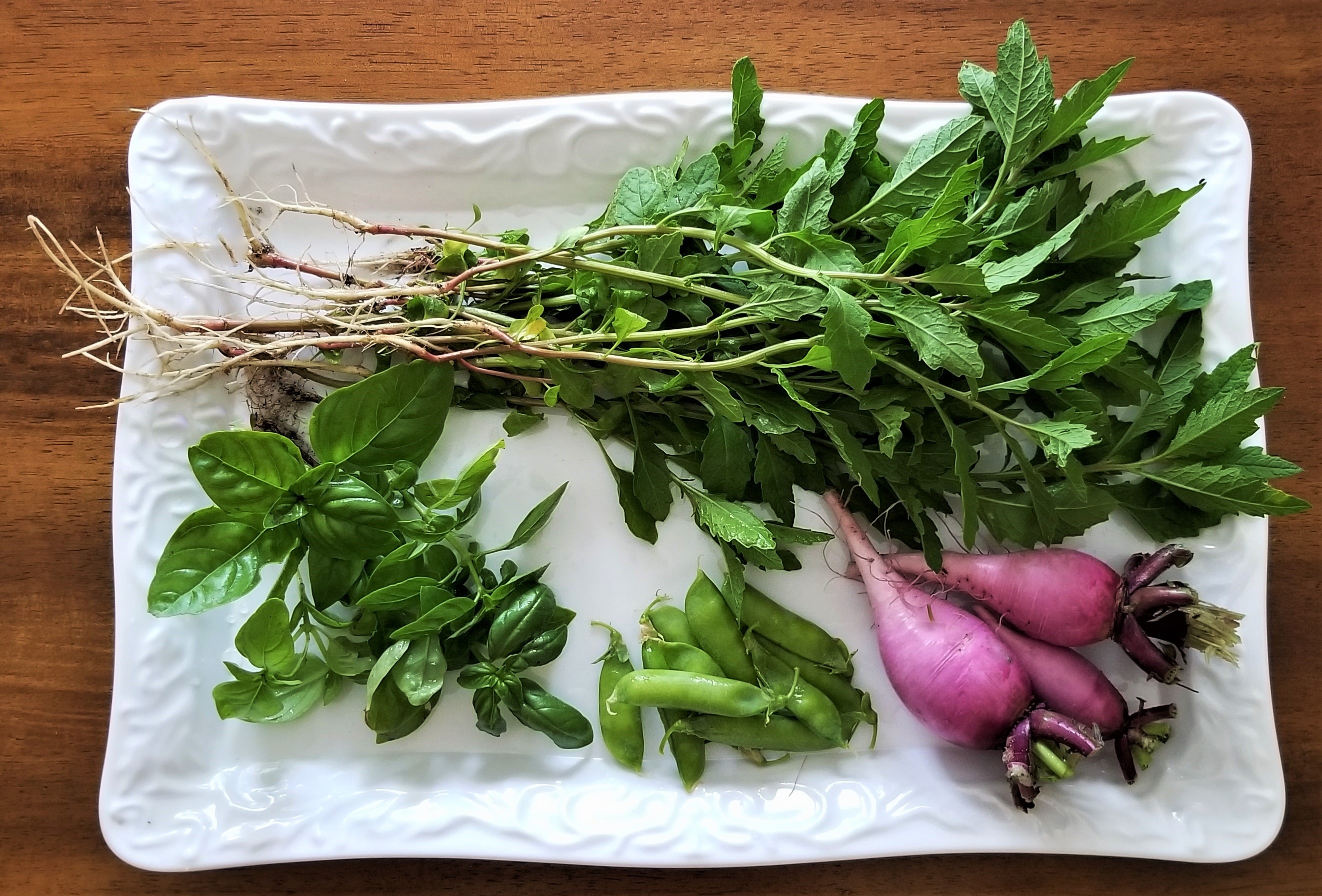 A few days ago, I harvested my first large bunch of epazote; I also gathered the first thinning of basil. From my new 2022 seed, I am still getting nice handfuls of “Little Marvel” peas, and I just picked the last of the purple radishes. I also harvested garlic and shallots … click on title for more