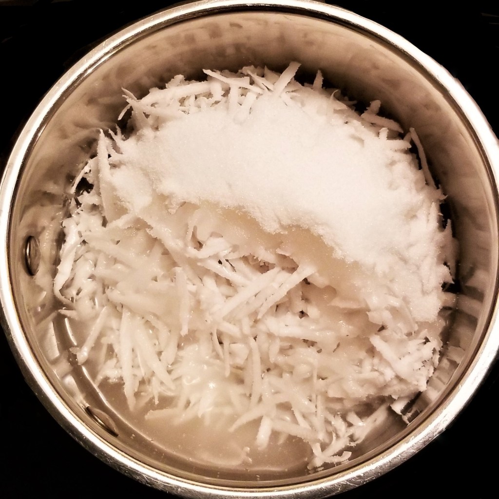 *NOTE: I started with one fresh coconut (click here for detailed printable directions). I got approximately half a cup of coconut water, and managed to avulse about 4 cups of flesh (I used the extra two cups for a batch of my cocadas de yema). If using dry shredded coconut, try to find the unsweetened type, or if sweetened, reduce the amount of sugar by a couple of tablespoons.