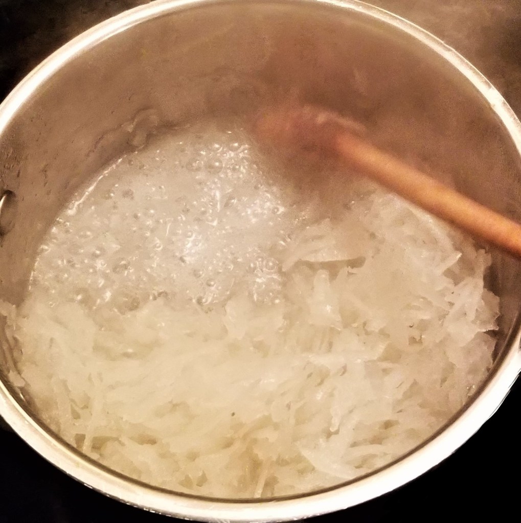 Place all ingredients in a saucepan over high heat to start melting the sugar (photo below, left). Bring to boil, and cook, stirring occasionally (photo below, right):