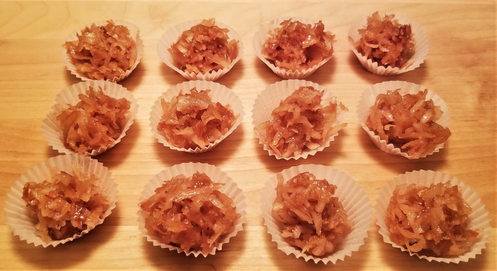 Remove pan from heat promptly, and immediately divide the paste into prepared paper cups, using two spoons to scoop and scrape. DO NOT TOUCH coconut paste with fingers, as it will be brutally hot: