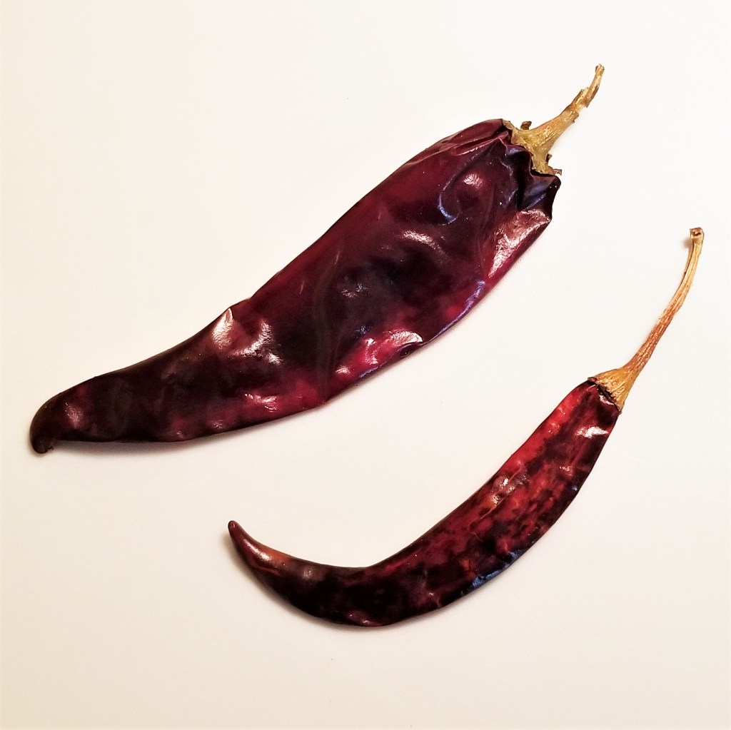 Note about puya peppers: Some cooks and food writers refer to them as “guajillo picante” – “spicy guajillo“. They are indeed similar to guajillo in flavour, and spicier; they are thinner and a little smaller than regular guajillos (photo below, left).