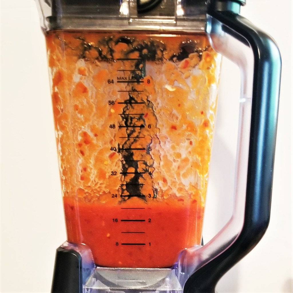 Place tomatoes, onion, garlic and salt in a blender jar, then add peppers and about half a cup of the soaking liquid (photo below, left). Process for at least one minute, to obtain a very smooth sauce (photo below, right):