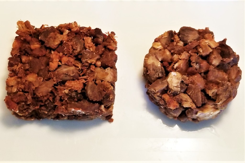 Chicharrón prensado is made from the bits left behind after frying large batches of pork meat and rinds (such as carnitas or chicharrón). The leftover bits are collected from the bottom of the pot, and pressed into perforated moulds, to compact the meat, fat and skin into a block, and squeeze some of the melted fat out. In a previous post, I talked about chicharrón prensado, and how to make a small batch at home, as shown below: