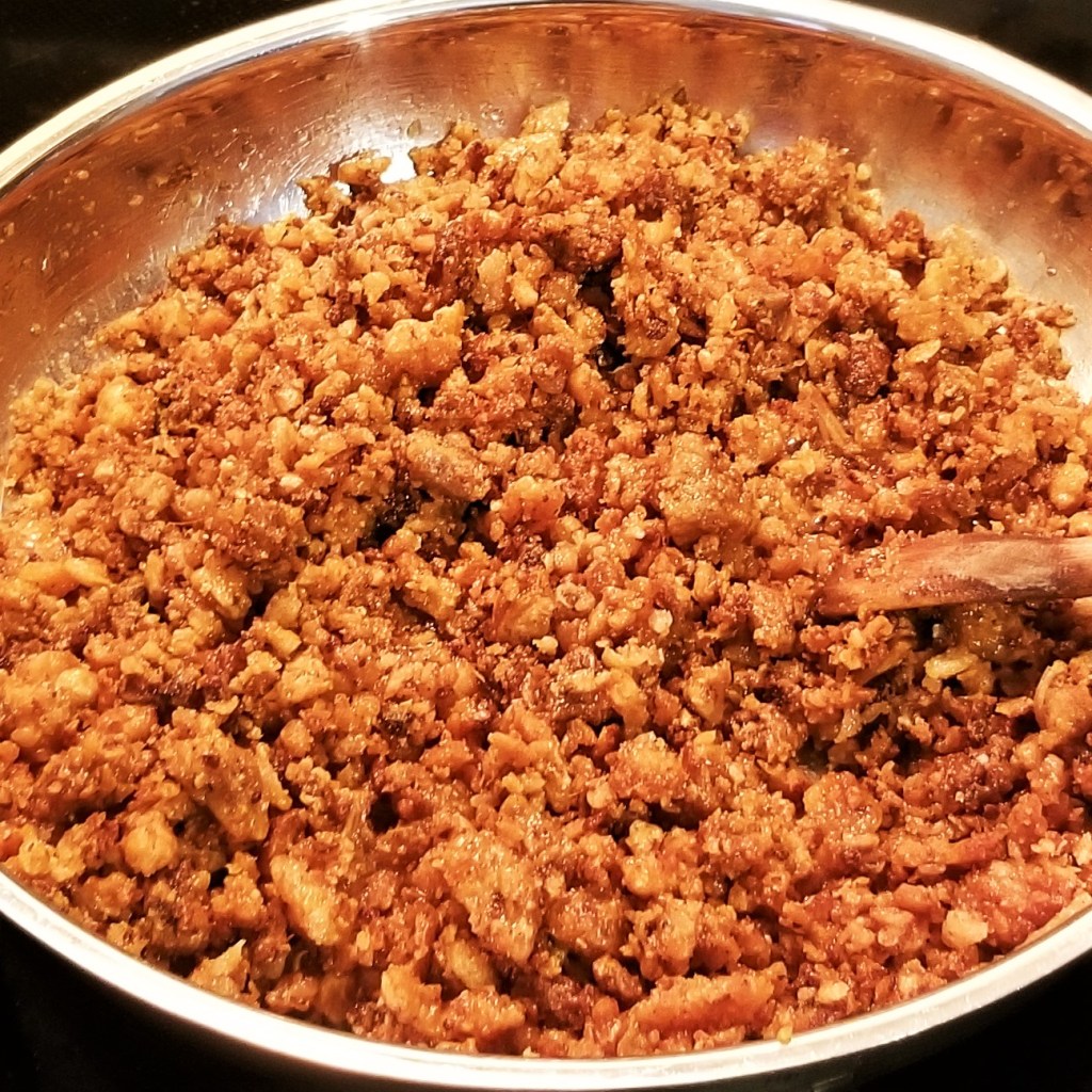 Chop pork cracklings, then place in a large pan over medium heat; cook, stirring, for about two minutes (photo below, left). Add reserved sauce (photo below, right):