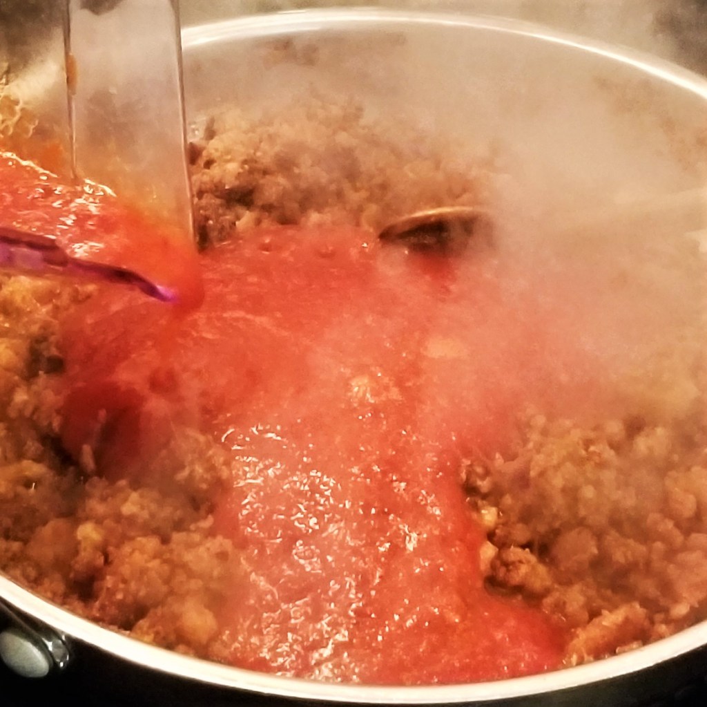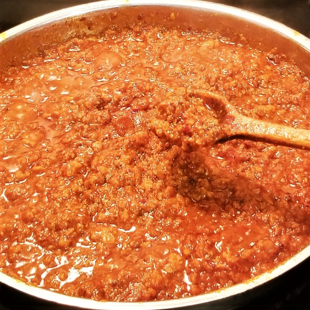 Continue cooking, stirring occasionally, until the sauce has thickened, about twenty minutes: