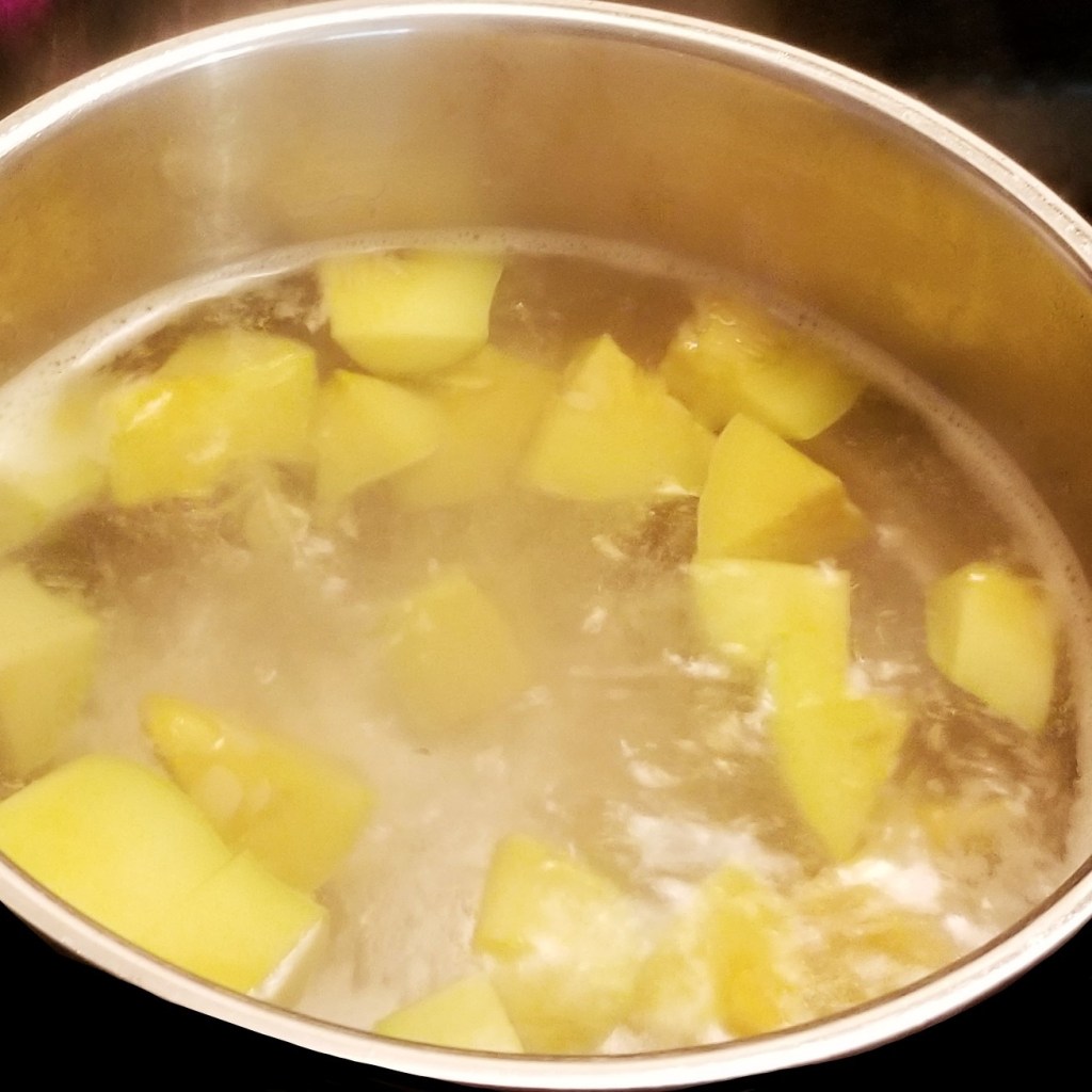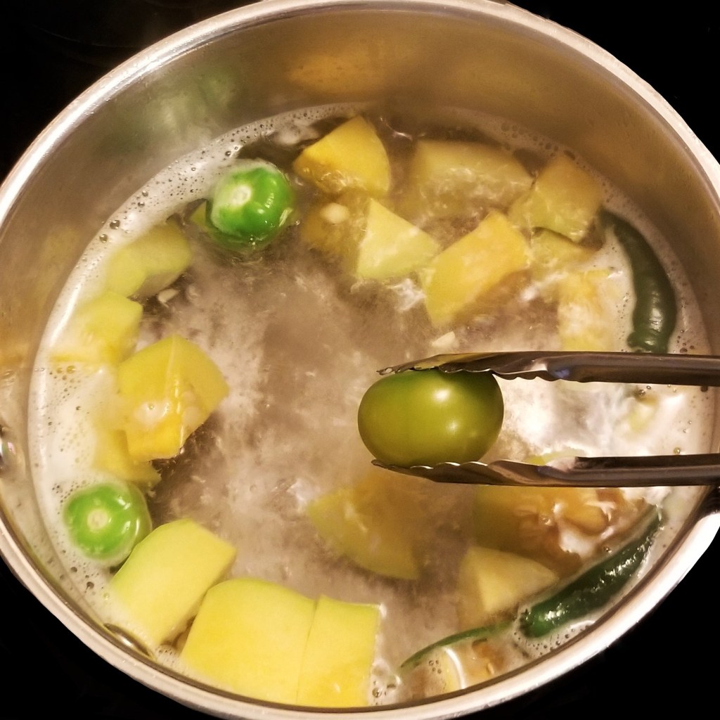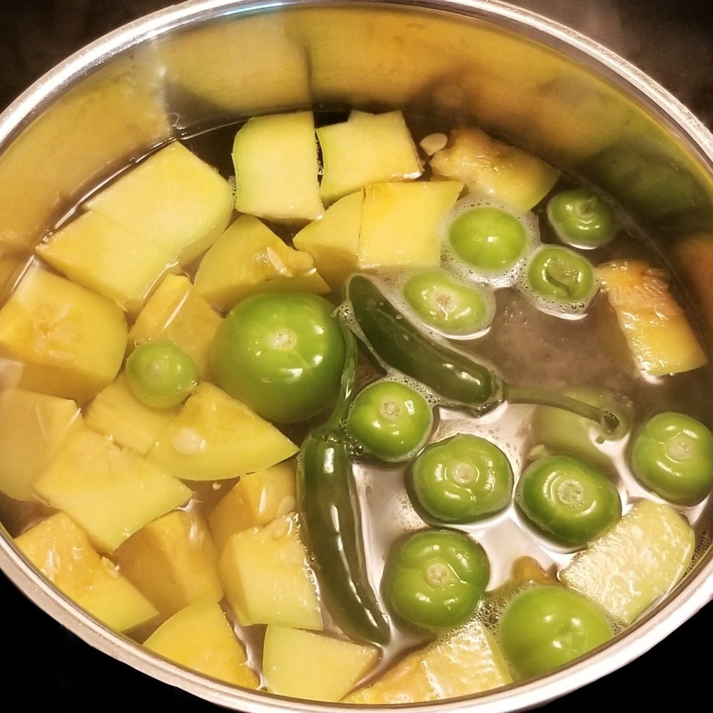 Cut and remove ends of squash, peeling is optional.  Slice squash into wedges lengthwise, then slice into cubes.  Bring a large pot with water to boil, then add squash, tomatillos, and hot green peppers (photo below, left).  Remove tomatillos and peppers when they start to change colour (photo below, right):