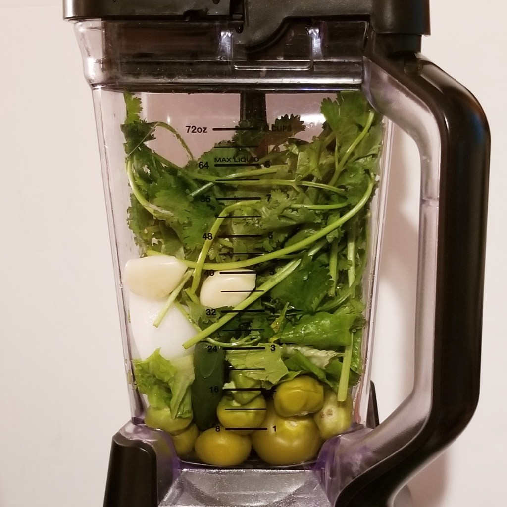 Transfer tomatillos and peppers to a blender jar, then add onion, garlic, epazote leaves (if using), lettuce and cilantro (photo below, left).  Process until smooth, makes about two cups of sauce (photo below, right):
