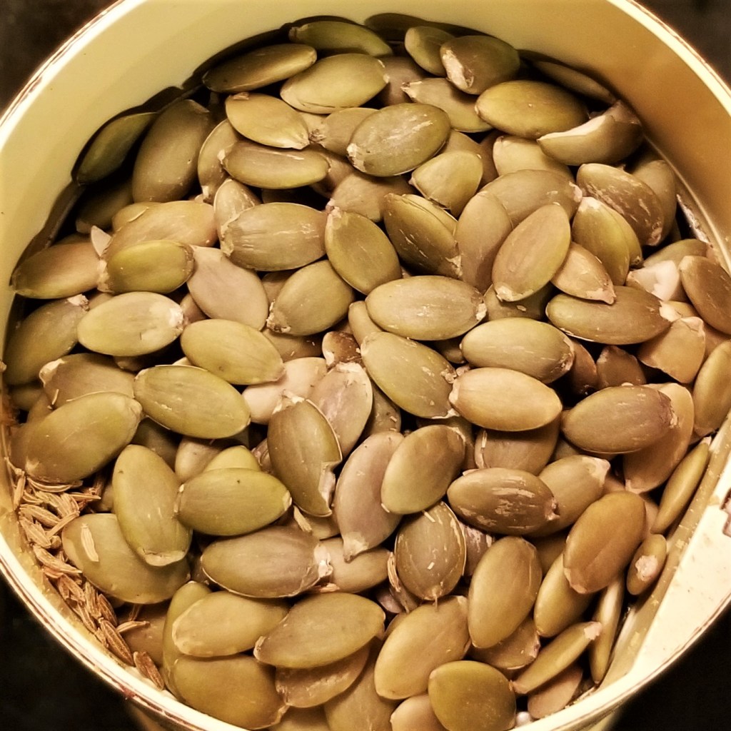 Place pumpkin and cumin seeds in a mortar, or a spice grinder (I have a dedicated coffee grinder, photo below, left); grind until powdery (photo below, right):