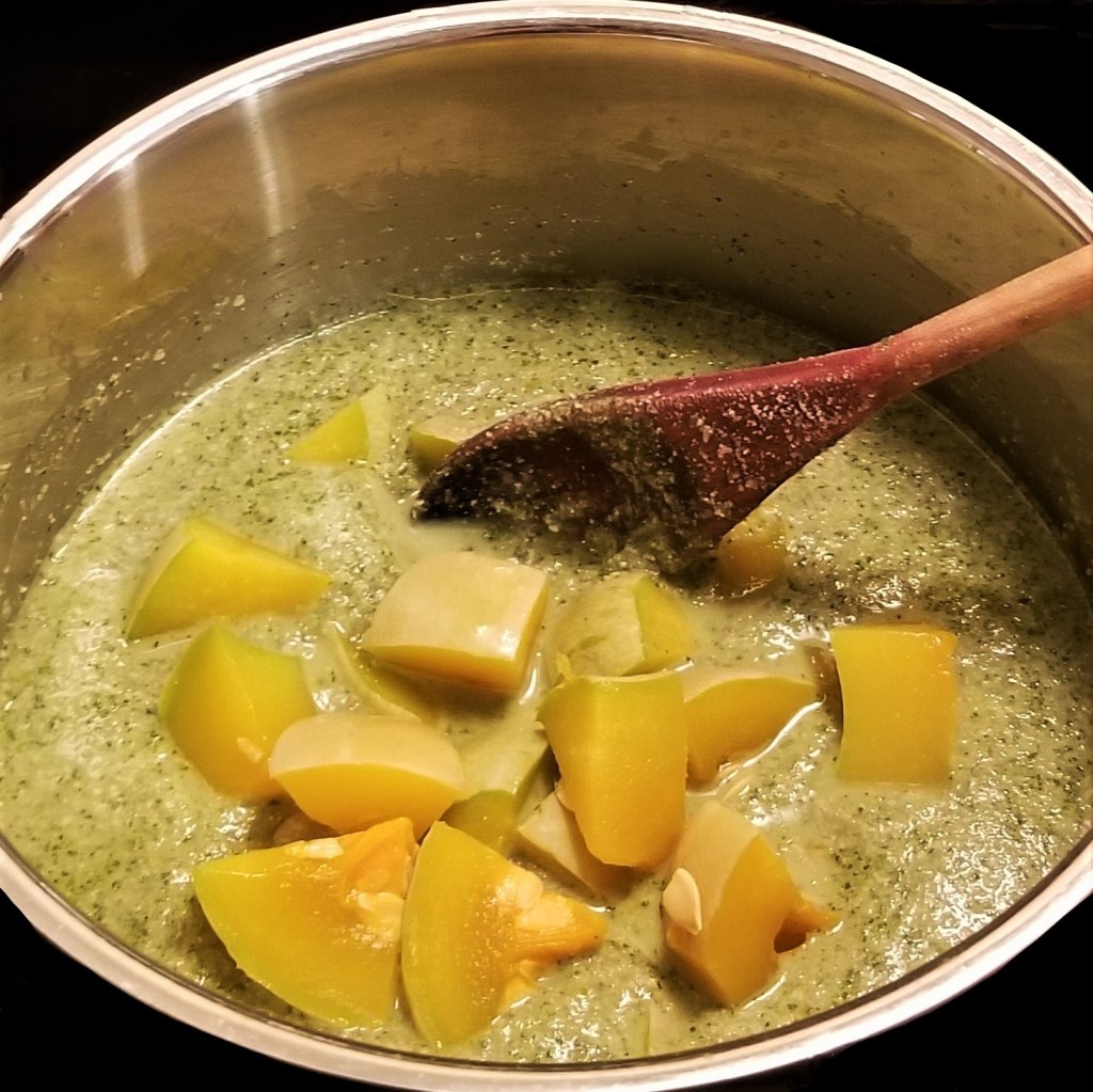 It was time to twitch my culinary creativity with a recipe that used all this bounty; just from the colour scheme, a green sauce came to mind, but the still-unripen butternut squash was a little puzzling.  Some fruits from the squash family are eaten while still immature, for example zucchini, and chayote (pear squash).  In Mexico, another iconic example is chilacayote (Cucurbita ficifolia), from the Nahuatl tzilacayotli, also known as the seven-year melon, Malabar gourd, or more commonly in the US and Canada, fig leaf gourd or fig leaf squash; chilacayote is often cooked in pipián verde sauce, either by itself or with a protein, such as chicken or turkey.  I have never seen fig leaf squash in stores here in Southern Ontario, but it served as the inspiration to make a batch of pipián verde with my still-green butternut squash.