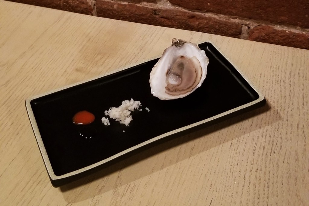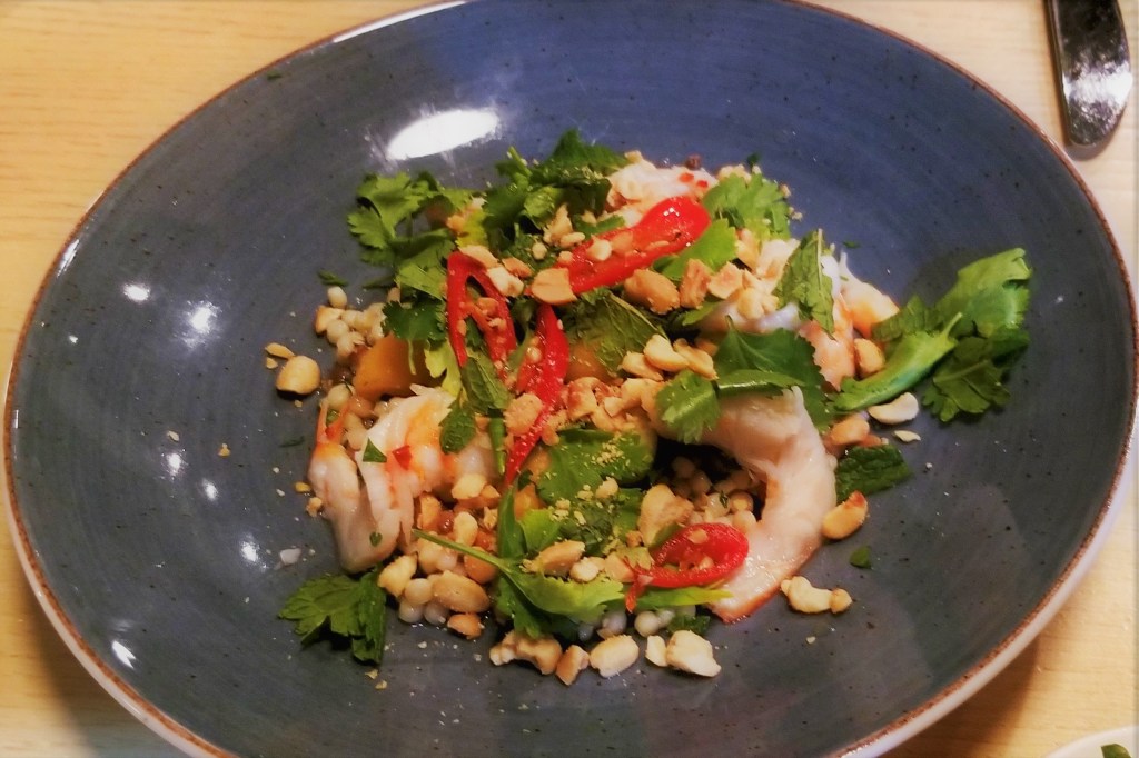 Featuring local ingredients and a very creative fusion cuisine, their menu provides a perfect opportunity to try a combination of traditional and innovative dishes. We started with some fresh oysters (photo below, left); truth be told, not as fresh as the ones we had in Cape Breton, but my husband enjoyed a summer salad with poached shrimp, melon, fregula (type of pasta from Sardinia), peanuts, chiles, nuoc cham, cilantro, and mint (photo below, right):