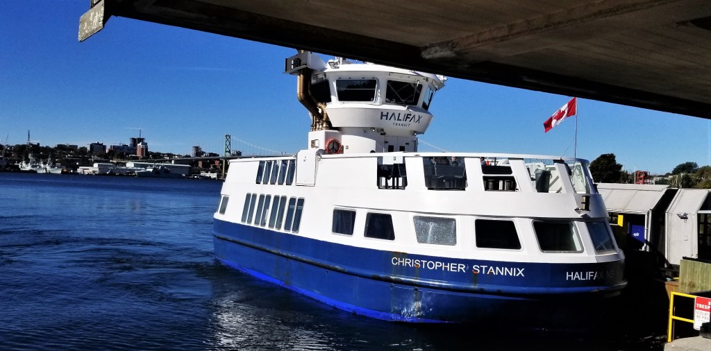 From Dartmouth, it is easy to reach downtown Halifax in no time across one of the Halifax Harbour bridges, the Angus L. Macdonald Bridge (opened in 1955) or the A. Murray MacKay Bridge (since 1970), or via the passenger and bicycle ferry, pictured below, with a view of the MacKay bridge and the Halifax Harbour in the background: