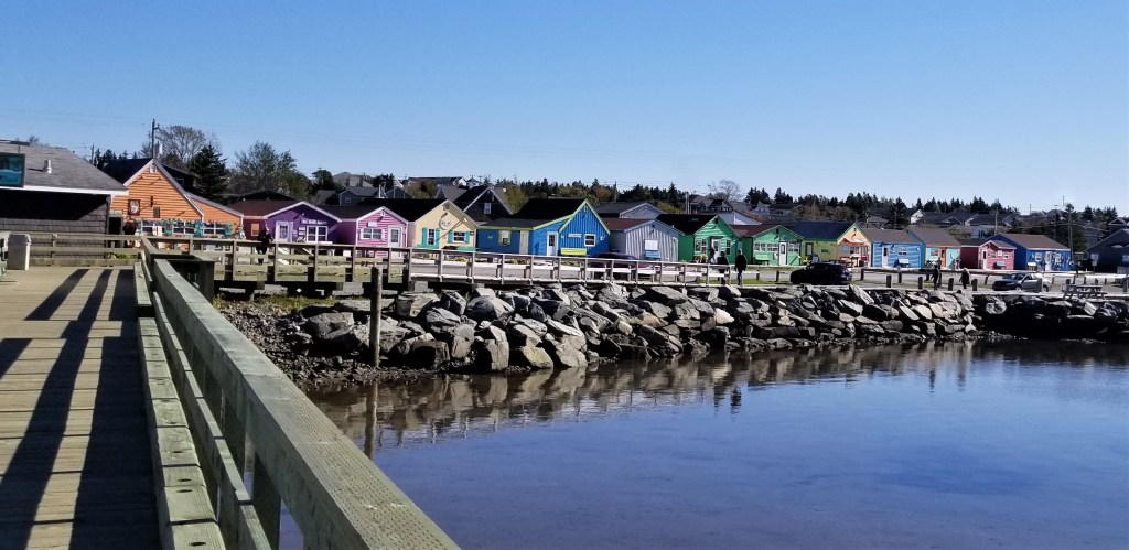 Continuing with my husband’s and my visit to our older daughter in Nova Scotia, Canada, a couple of our days were spent in the capital city of Halifax, and neighbouring Dartmouth. Fisherman’s Cove is a quaint section of the Dartmouth shore area, first charted as the “Eastern Passage” by Captain James Cook, as a description of its location within the Halifax Harbour. In 1996, it was re-developed, acquiring its current name and becoming a tourist attraction, while preserving its original use as a wharf for local fishermen. A strip of whimsical and colourful structures houses a variety of souvenir stores, restaurants and ice cream parlours (slide show below):