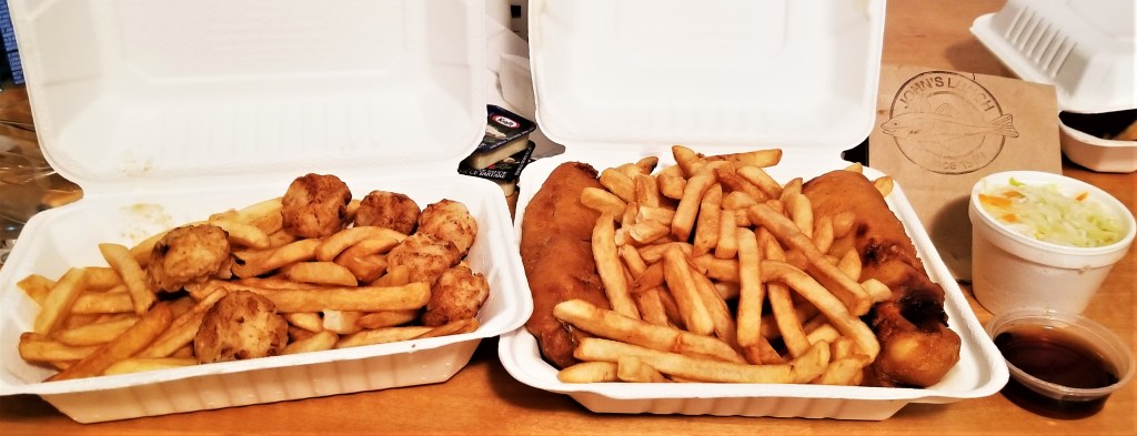 A nice take-out restaurant nearby is John’s Lunch (352 Pleasant Street, Dartmouth, NS). Established in 1969, it has been honoured several times with The Coast’s ‘Best of Halifax Awards’ for “Best Fish & Chips”, “Best Seafood” and “Best Diner”. This was truly some of the best I have ever had, and a very good value for the price, as well. In the photo below, from left, scallops & chips, award-winning fresh haddock & chips, with coleslaw and malt vinegar on the side:
