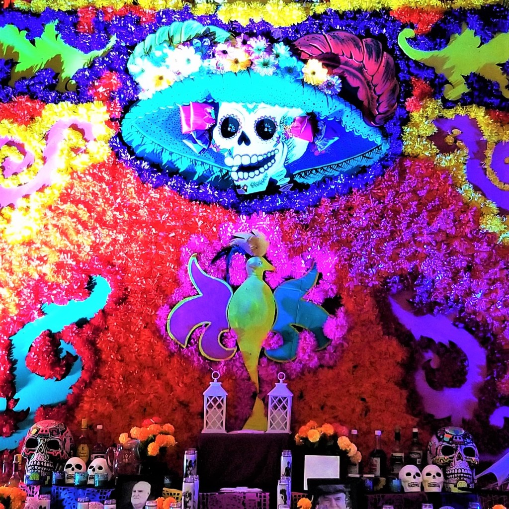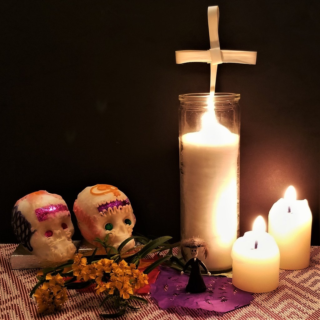 My small ofrenda de día de muertos (Day of the Dead offering) this year includes just a few elements: papel picado (chiselled paper), calaveritas de azúcar (sugar skulls), candles, a religious symbol in the Cross, some droplets of colour in the bright yellow Yautli flowers from my garden, and a tiny figurine of la catrina, in her feathery hat and all:
