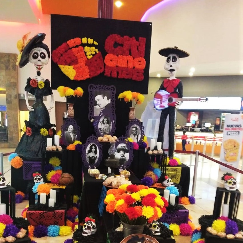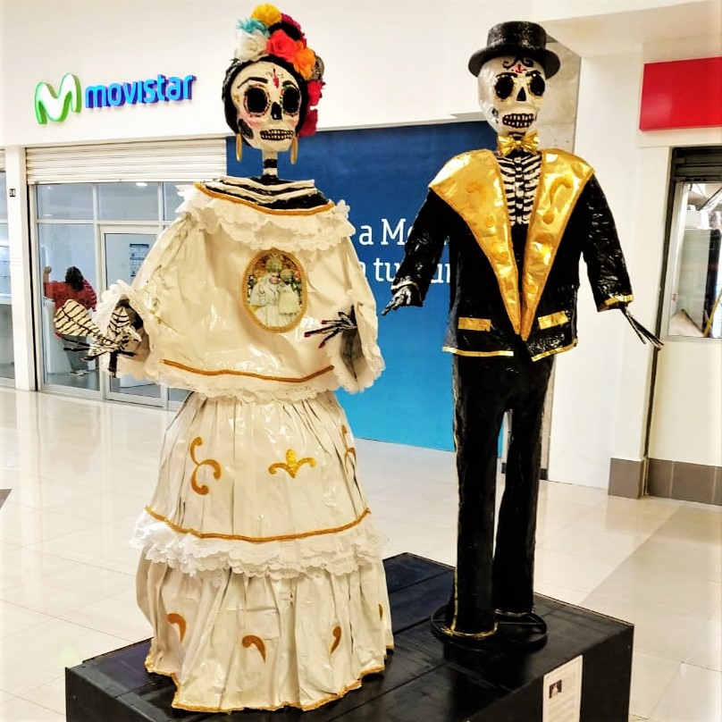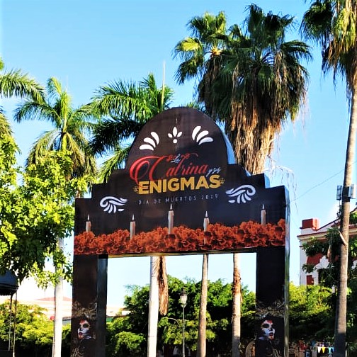 Displays with catrinas in Culiacan, Sinaloa (photos from my sister, from left to right) at a park, a mall, and a movie theatre:
