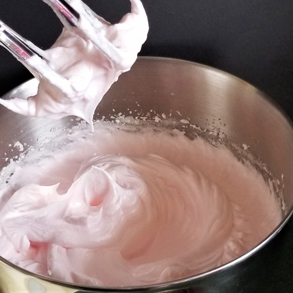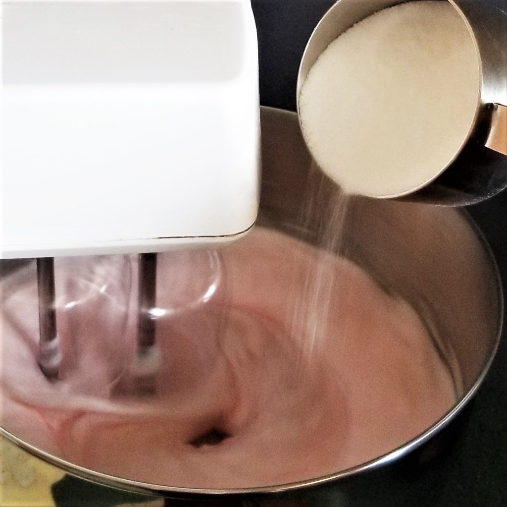 Continue whisking while adding food colouring, and then gradually, the sugar (photo below, left). Continue beating until the mix is glossy and firm (photo below, right):