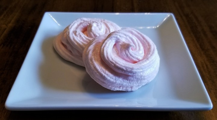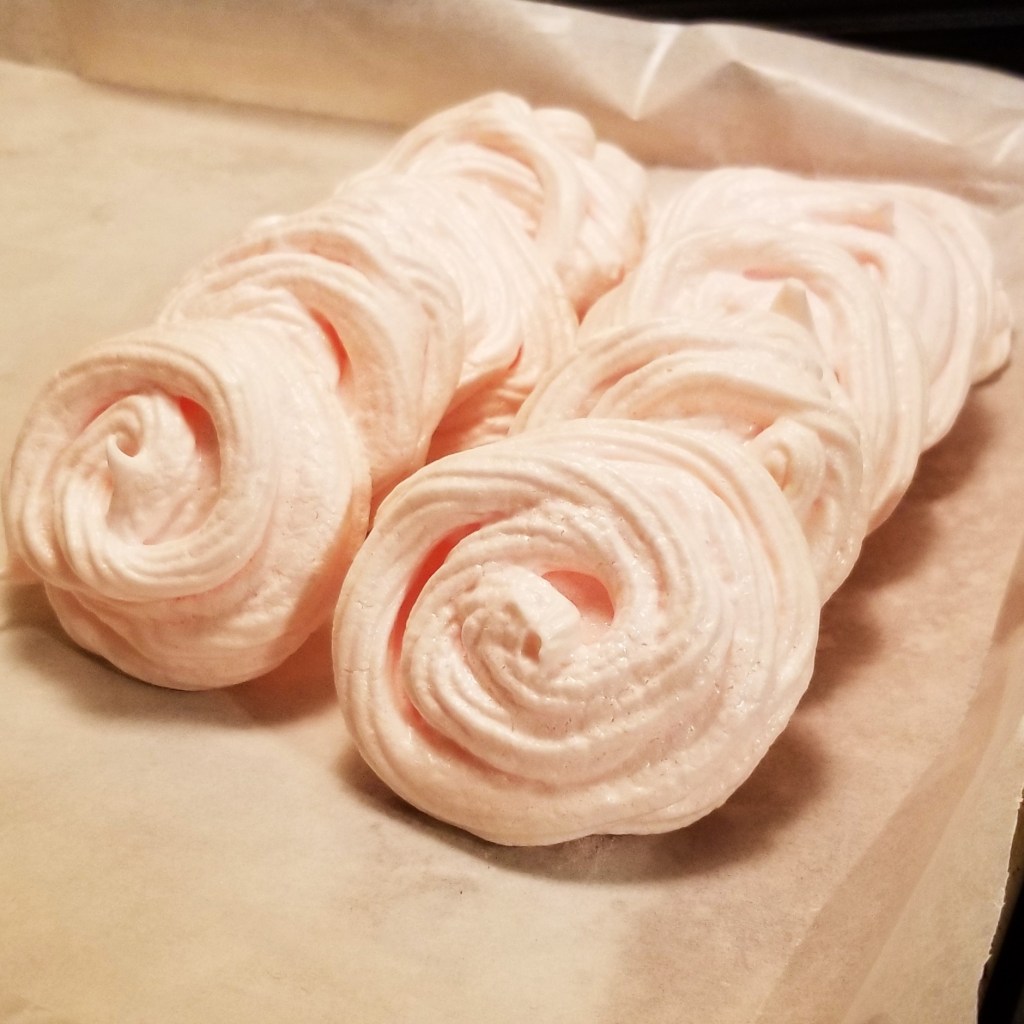 The round pink meringues are similar to pavlovas, dry on the outside and creamy and soft inside, as pictured at the top of this post, and prepared as follows: