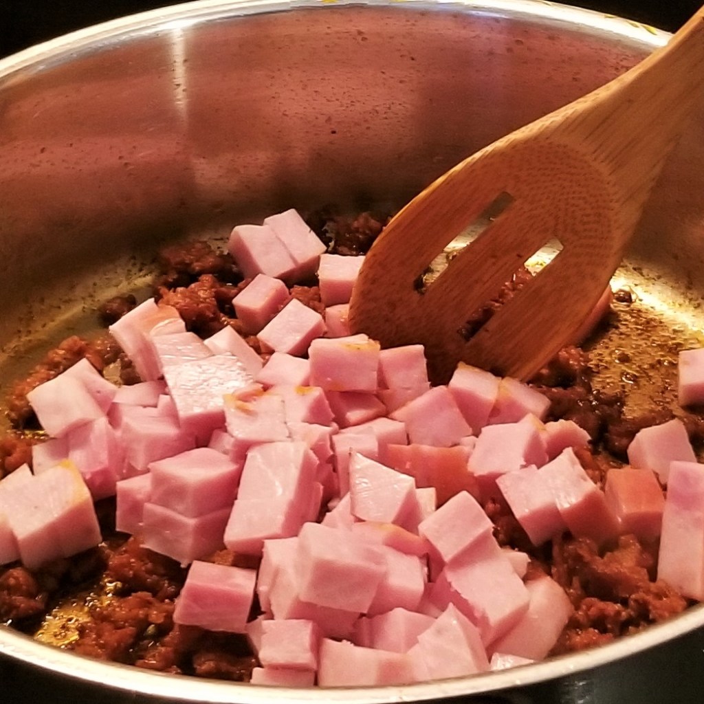 In a large pan over medium heat, cook the chorizo, breaking into small pieces (photo below, left). Once crispy, incorporate cubed ham (photo below, right):